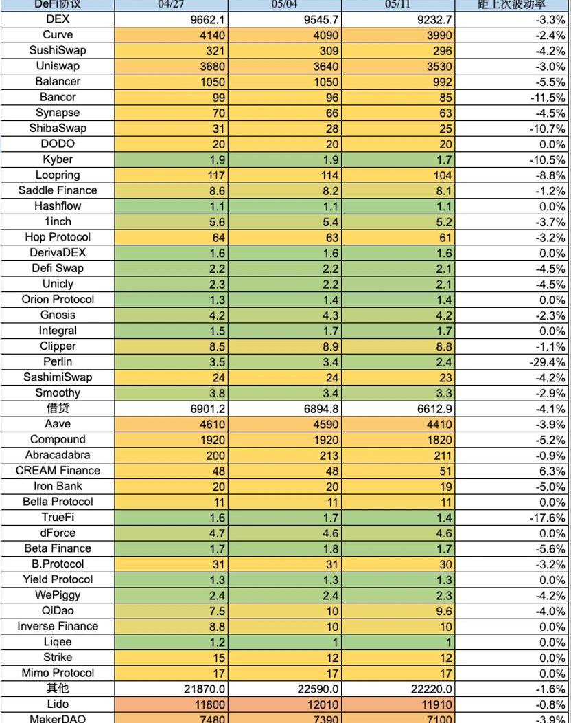 本周?TVL?總量繼續下跌?2.1?b,下降幅度為?4.3%?。本周ETH鏈占比與上周基本持平,略微下降到?58.08%?,降幅~?0.6%?,近幾個月的大趨勢看?eth?生態的?TVL?在穩定上升。