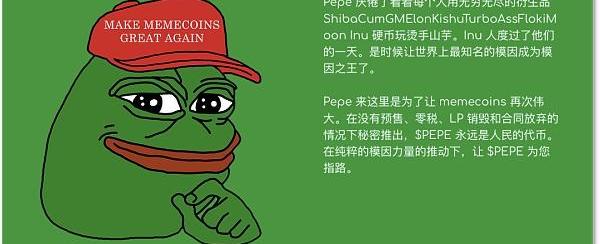 至于PEPE為什么在幣圈火了,誰也說不清楚,只是這個項目出現了,一些幣圈大V開始談論它,有人去購買它,熱度越來越高,買的人也越來越多。至于價值,官網說了,PEPE完全沒用,僅供娛樂,沒有正式的團隊或項目發展路線圖,也與悲傷蛙的創作者沒有任何關聯,只是向大家喜歡和認可的meme致敬。