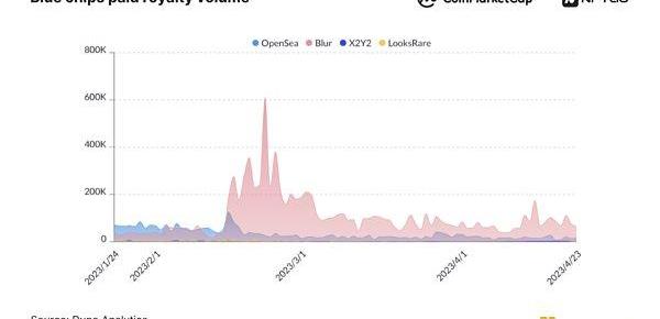 研究機構Hildobby的數據顯示,OpenSea長期以來一直主導著版稅榜單。然而,自2月中旬以來,局面發生了逆轉,Blur的版稅收入超過了OpenSea,并與后者保持平齊。在3月份,Blur和OpenSea仍是版稅收入的主要領導者,但是Blur在3月3日達到了1.7百萬美元的版稅峰值。另一方面,OpenSea的版稅收入在2月底降至30萬美元的低谷,而在2月20日達到150萬美元的峰值后迅速下滑。這種差異表明Blur現在是版稅市場份額的新領導者。Blur贏得的主要原因是推出了可選版稅和零手續費的方法,針對市場上最關注價格的用戶。
