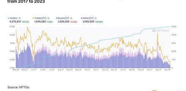 1.2023年第一季度NFT交易量出現了急劇增加,然后又下降。這是由于Blur的激勵和空投,導致NFT持有人數量于4月19日降至過去12個月中的最低點,僅有11,187名交易者。