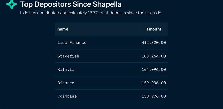 ?Kraken?的提款最多,為?647?kETH,由于最近的監管打擊,自升級以來,約占所有?ETH?提款的?26.3%?,其次是?Coinbase、Binance?和?Lido。
