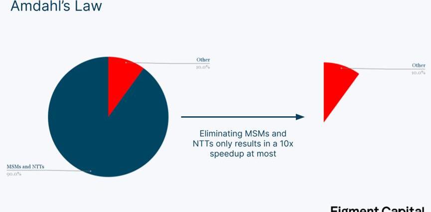 然而,加速MSM和NTT僅僅是零知識加速的第一步。即使我們可以假設將MSM和NTT的計算時間降至0?,我們也只能實現證明生成時間的5-20倍加速。這是由于阿姆達爾定律,該定律指出,加速度受我們實際進行計算的時間部分的限制。如果MSM和NTT占了90%的證明時間,消除它們仍會留下10%的證明時間。