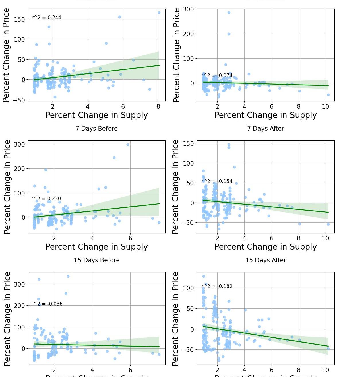 乍一看,這些結果似乎支持了我們的假設。通常在解鎖前出現正相關性,表明解鎖前價格較高。在解鎖發生后,我們看到負相關關系,表明價格下降了。