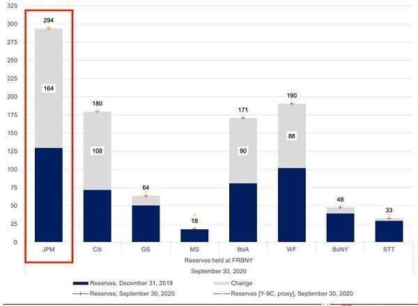 在新的體系中,美聯儲的許多缺陷很快變得顯而易見。每當美國財政部進行「印鈔」行動時,國債的利率就會降至目標范圍的下限以下。快進到2019年9月,聯邦基金利率和回購市場的利率都突破了其目標范圍的上限。美聯儲當時依賴其主力銀行JP摩根來重新調整利率。由于在無休止的量化寬松注入后,這家超級銀行擁有最多的儲備金,它應該成為美聯儲的最后一道防線。