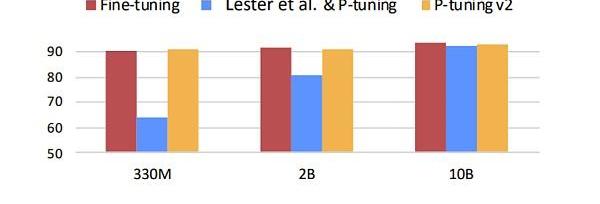 問題來了,這么少的參數真的能逼近?finetuning的效果嗎,當然還是有一定的局限性。如下圖所示,藍色部分代表初版的prompttuning,可以發現prompttuning僅有在模型參數量級達到一定程度是才有效果。雖然這可以解決大多數的場景,但在某些具體垂直領域的應用場景下則未必有用。因為垂直領域的微調往往不需要綜合的LLM預訓練模型,僅需垂直領域的LLM模型即可,但是相對的,模型參數不會那么大。所以隨著發展,改版后的prompttuning效果可以完全取代fine-tuning。下圖中的黃色部分展示的就是prompttuningv2也就是第二版本的prompttuning的效果。