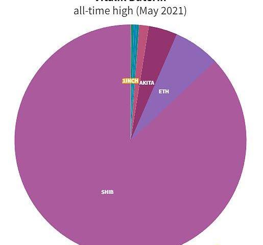 根據ArkhamIntelligence,Buterin已知的加密資產組合在2021年5月的價值約為20億美元。可以理解,ETH約占這些資產的一半。但在狗幣狂熱中,Buterin的價值遠不止于此。