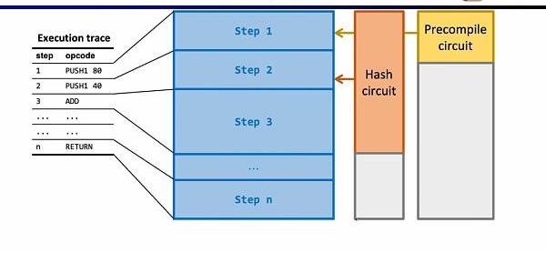 接下來,我們看zkEVM的完整流程,基于初始的全局狀態樹,一筆新的交易進來后,EVM會讀取存儲和調用的合約的字節碼,根據交易生成相應的執行蹤跡例如PUSH,PUSH,STORE,CALLVALUE,然后逐步執行更新全局狀態,得到交易后的全局狀態樹。而zkEVM是將初始的全局狀態樹,交易本身,以及交易后的全局狀態樹作為輸入,根據EVM的規范,來證明執行蹤跡的執行正確性。