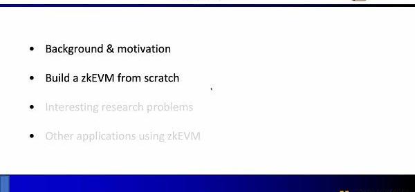 XRP/HKD-1.85%演講分成四個部分,第一部分張燁介紹了開發背景以及我們為什么首先需要zkEVM以及為什么它在最近兩年間變得如此受歡迎,第二部分通過一個完整的流程,講解如何從頭開始構建zkEVM包括算術化和證明系統,第三部分通過一些有趣的研究問題來談論了Scroll在構建zkEVM時遇到的問題,最后介紹了一些其他使用zkEVM的應用。
