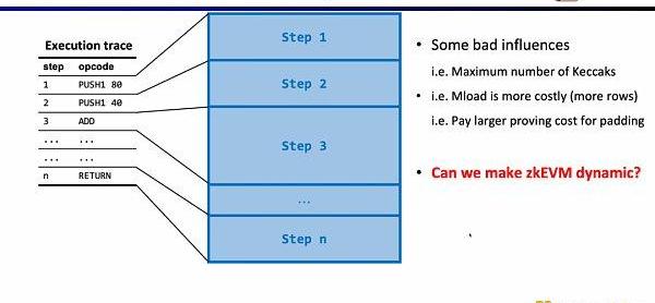電路方面第三個有趣的研究問題是動態規模。因為不同的操作碼的電路規模不同,但為了滿足動態變化的執行蹤跡,每一步的操作碼都需要滿足最大的電路規模,例如Keccak哈希,因此我們實際上付出了額外的開銷。假設我們可以使zkEVM動態適應動態變化的執行蹤跡,這將節省不必要的開銷。