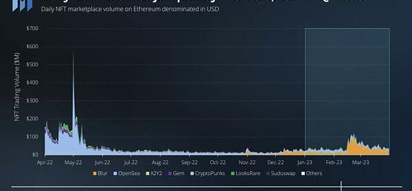 2023年第一季度,每日NFT交易量激增146%,達到4500萬美元。Blur空投活動后,活動明顯增加。Blur以每日2900萬美元的交易量領跑NFT交易量占比,達到64%。其次是OpenSea,每日交易量為1100萬美元,交易量占比為25%。