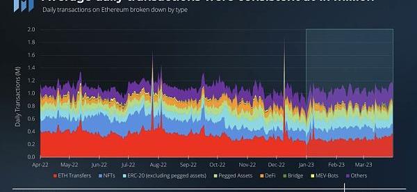 DeFi活動的下降可能是由于以太坊Layer-2的作用日益增大。自L2推出以來,其交易份額每個季度都在穩步增長。2023年第一季度,L2占交易份額從2022年第四季度的38%增加到2023年第一季度的45%。由于Optimism的激勵計劃在1月份結束,L2份額有所下降,但隨著Arbitrum交易的增長,它在本季度后期恢復了增長。在ARB代幣發布當天,L2份額創下了73%的歷史最高水平。