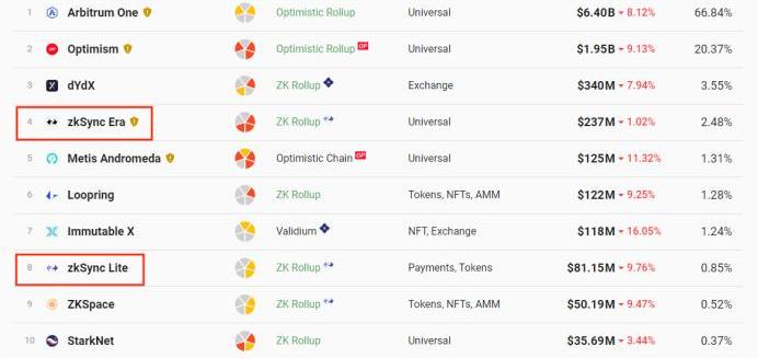 曾經的layer2四大天王:Optimism、Arbitrum、zkSync、StarkNet,已僅剩后兩者沒有分配治理token。Optimism和Arbitrum先后實踐了生態積累+用Token搶用戶的打法,結果已經在Layer2生態的市場份額中得到體現。zkSync是目前以太坊zkrolluplayer2解決方案中的龍頭協議,zkSync有兩個網絡版本,1.0為lite,2023年3月24日開啟了2.0網絡era。zk擴容方案被認為是以太坊可擴展性的終極解決方案,同時也是最被v神看好的,zkrollup在安全性和性能方面取得比較好的權衡,并使用零知識證明,可以做到實時交換。但由于以太坊虛擬機不支持ZK線路,實現一直是有較大難度。因此OptimisticRollups類型的解決方案率先發Token,賺足了市場熱度,比如目前火熱的Arbitrum、Optimism,而zk系列還沒有發行Token。