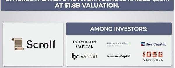 2023年3月,Scroll又宣布融資了5000萬美元,投資者包括PolychainCapital、紅杉中國、貝恩資本Crypto、摩爾資本管理公司、OKXVentures、VariantFund、NewmanCapital、IOSGVentures和啟明創投。