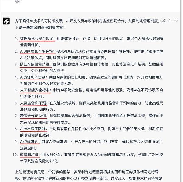 那么,問題擺在眼前,如果要讓研究人員和政府制定規則,該包含哪些內容呢?ChatGPT給出了十大建議,相當于給包括自己在內AI發展畫了一個規范圈。