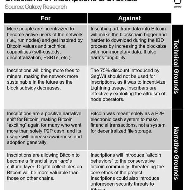 這一區塊鏈新用途在比特幣社區引發了重要的關切。自2023年1月中旬起,銘文量加速增長后,更廣泛的比特幣社區就其對比特幣的影響展開了激烈的辯論。有關銘文的爭議凸顯了生態在比特幣區塊鏈的適當使用方面的技術和敘事層面上的分歧。以下簡表可視化呈現支持和反對方在銘文和序數方面的觀點。