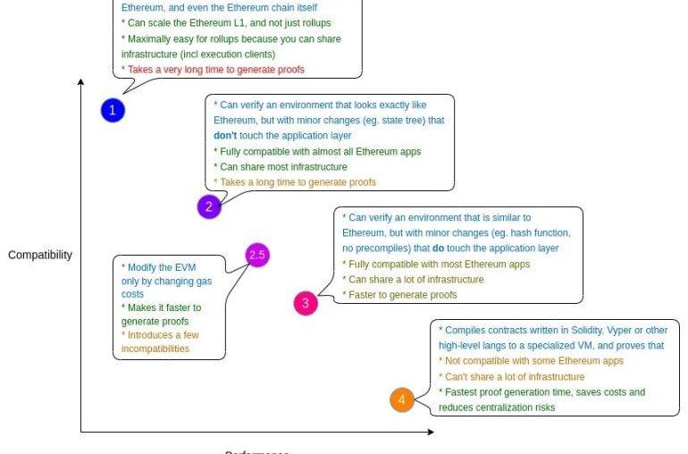 在2022年8月的一篇博文中,Buterin提供了一種衡量zkEVM項目能力的方法,方法是提出從Type1到Type4的等級來對它們進行分級。Type1zkEVM將與EVM完全等效,甚至可以用于升級以太坊本身,而Type4zkEVM僅與某些以太坊應用程序兼容。