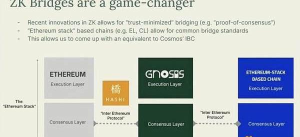 MartinK?ppelmann?認為L2雖然有可取之處,但我們需要更多的L1,因此提出來類似于Cosmos的IBC模型,計劃再做另一個側鏈和以太坊運行一樣的內容,然后通過無信任的ZK-bridge來連接,組成一個以太坊宇宙。