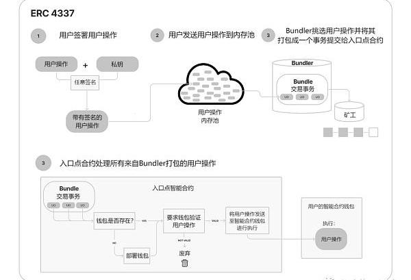 Bundler將用戶操作內存池中的用戶操作進行打包處理成一個事務并提交給入口點合約