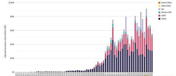 2、調整后的穩定幣鏈上交易額減少至5581億美元,跌幅達到了17.6%;已發行穩定幣供應量則進一步收縮至1284億美元,降幅約為3.2%,其中美元穩定幣USDT和USDC的市場份額分別上升至55.7%和31%。另一方面,紐約州金融服務部命令PaxosTrustCo.停止發行更多的BUSD代幣之后,已有價值約56億美元的BUSD被銷毀。