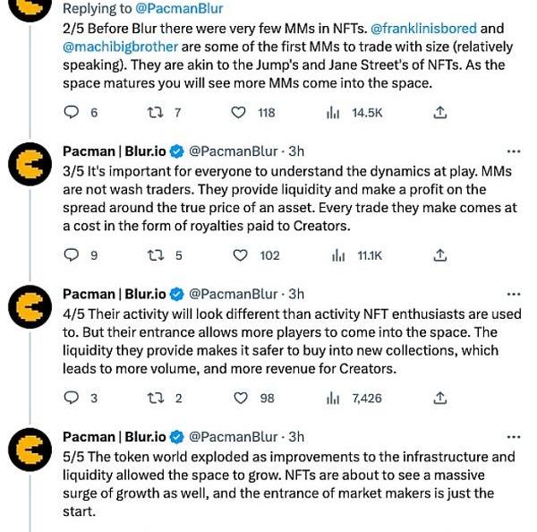 Pacman覺得傳統市場和代幣市場的絕大部分交易量來自少數做市商。在Blur之前,NFT中的MM非常少,隨著這個市場的成熟,你會看到更多的MM進入這個市場。MM提供了流動性并從資產真實價格的價差中獲利,他們進行的每筆交易都以支付給創作者的版稅形式出現,為創造者帶來更多收入。