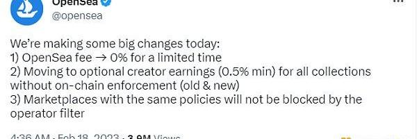 2023?年?2?月?18?日,OpenSea?宣布短時間內實施?0%?交易手續費的政策,同時對于所有?NFT?合集都采用可調節式的版稅政策,最低版稅水平?0.5%?,并且取消了對?Blur?的黑名單工具。這一行為已經足以證明,OpenSea?感受到了?Blur?對它造成的巨大威脅,不得不采用更低的費用、更靈活的版稅政策來做抵抗。