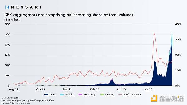 很明顯,聚合器正在爆發。Messari的數據顯示,現在以太坊上所有DEX成交量的20%來自DEX聚合器。