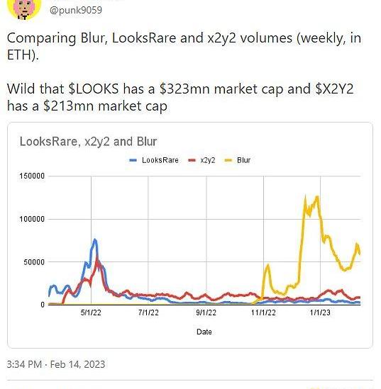 目前BLUR的交易非常不穩定,但當前的市場活動表明,該代幣的市值約為2.53億美元。這使得該代幣的市值與類似構造的LOOKS和X2Y2代幣市值大致相同,盡管Blur最近的NFT交易量比LooksRare和X2Y2多得多。