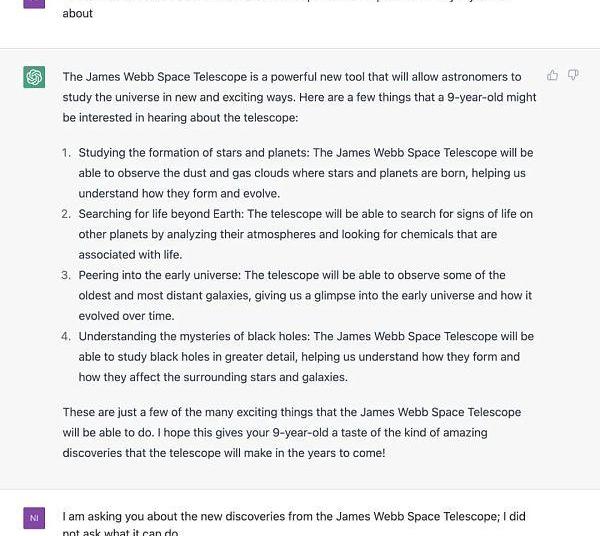 AI犯錯不可怕,正如前文所說的,ChatGPT上同樣充斥著大量似是而非的虛假信息,而且比較來說,對于同樣一個問題,ChatGPT的回答并不好,它只能回答出來JWST能做一些什么,而沒有辦法回答它的新發現,更不用說以一種小孩更能理解的通俗易懂的方式來解釋。