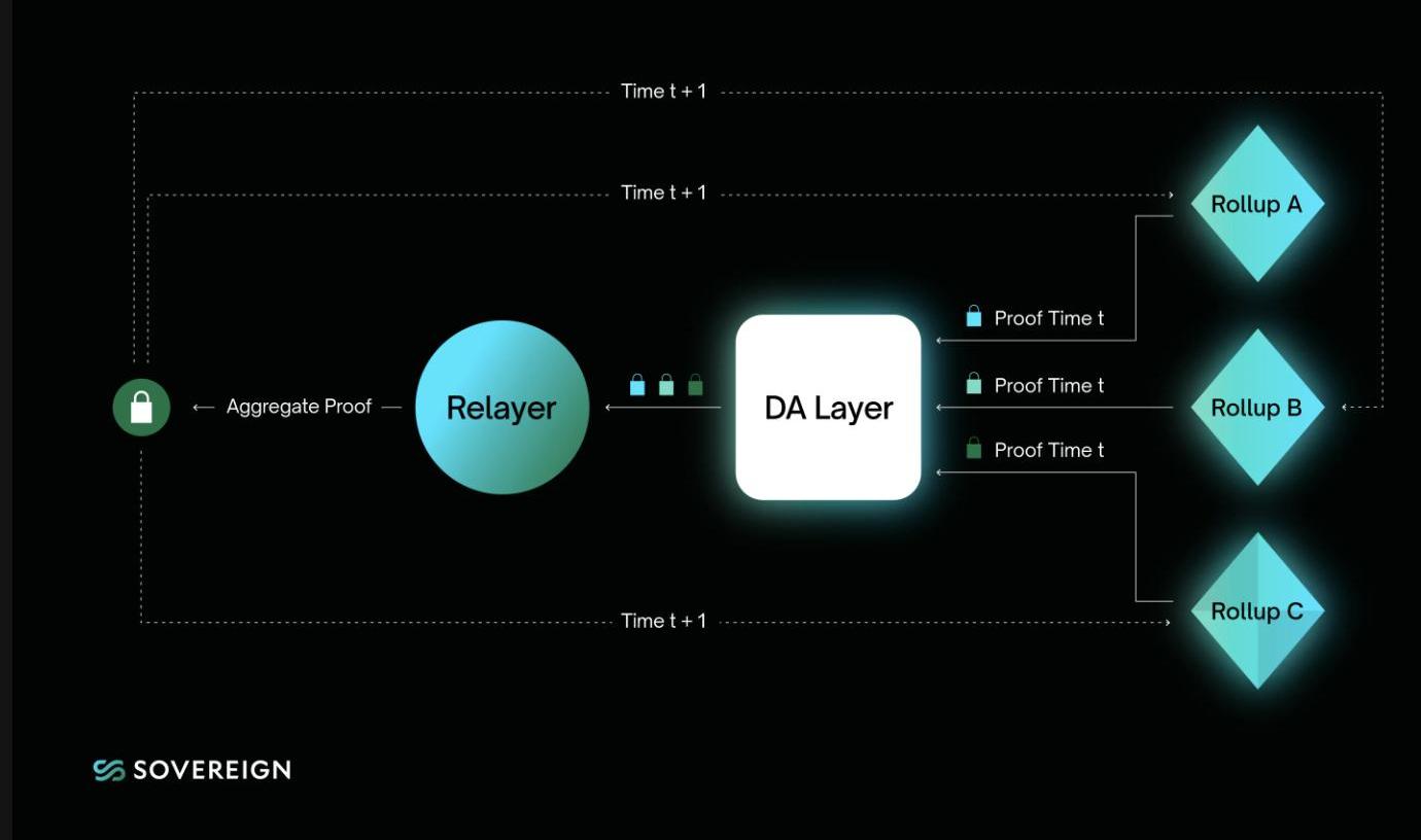 1、SovereignSDKrollups將無縫互操作:Sovereign使用一種基于證明聚合的新型跨鏈橋技術,允許共享L1上的SovereignSDKrollups在沒有一個受信任第三方的情況下來回跨鏈。由于zk-proofs可以聚合,rollups將能夠以最小的成本維護盡可能多的跨鏈橋。鏈下中繼器可以將所有peerrollup的證明聚合成一個證明,并且可以在鏈上驗證這個證明。而且由于狀態轉換被證明是有效的,因此無需向流動性提供者支付費用或等待一周的時間來完成交易。可以立即完成跨鏈,沒有缺點。