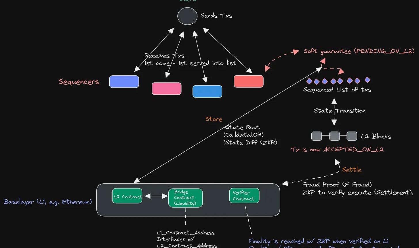 這樣做是為了降低交易的成本,把盡可能多的交易放在一個證明中,否則,交易的成本會急劇上升。這就是交易在rollup中被最終確定的方式--它們得到一個軟最終性的保證,即最終它們會在底層被最終確定。在Optimisticrollups的情況下,交易反而是分批進行的,狀態根與calldata一起被發送到Ethereum的L2合約。由于爭議期的要求,Optimisticrollup的交易的實際最終結果要到7天左右才會發生。這意味著它們的實際軟最終保證會持續相當長的時間,以使觀察者能夠證明任何已經發生的欺詐行為。這些都是我們在去中心化定序器集時需要解決的問題;軟最終性需要得到保證,最終的最終性需要達到,同時允許證明按預期發揮功能。