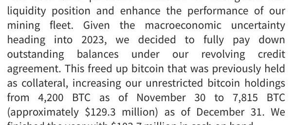 譯文:“我們還采取了積極措施,以加強我們的流動性狀況,提高我們礦業船隊的表現。鑒于2023年宏觀經濟的不確定性,我們決定根據循環信貸協議全額償還未償還余額。這釋放了以前作為抵押品持有的比特幣,將我們不受限制的比特幣持有量從11月30日的4,200BTC增加到12月31日的7815BTC。