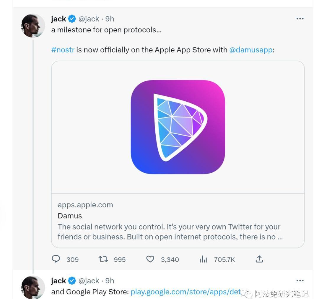 2023年2月1日,JackDorsey發了關于Damus在蘋果商店和Google應用商店上架的消息,然后瞬間引爆了,筆者推測,除了Jack的名人效應之外,還是因為應用在移動端出來了,畢竟目前全球大部分人在移動端的場景是使用頻率是更多的,另外,近期市場表現平平因此,出來這樣的應用也很容易引人注意。