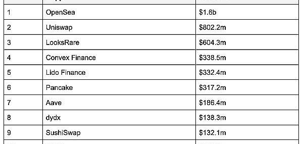 獲取新用戶即是流量入口,提高留存率得靠產品價值,推介與自傳播放大社群力量。這三個步驟都是為了創造營收,因為只有用戶增加了,才能實現規模化盈利。根據TokenTerminal2022年的數據,我們可以對dApp的盈利能力做個排序。