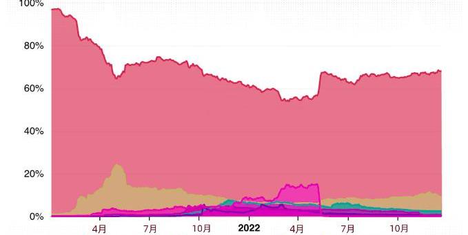 2022年,L1的總鎖倉價值(TVL)下降,與其他L1相比,以太坊的市場份額有所下降,按TVL計算從2021年的96.91%持續下降到2021年底的62.43%?,并在?2022年的6月進一步下降至59.01%?。