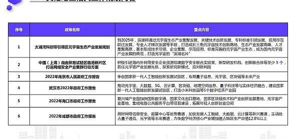 為方便大家全面了解各地元宇宙相關政策資訊,更好在產業生態中尋找發力點,本期匯整了2022年元宇宙相關政策合集,以供參考。