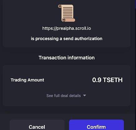 7.在添加網絡和領取測試代幣之后,首先可以通過點擊測試網網站上方的Bridge?測試跨鏈功能,我們以從Layer1向ScrollLayer2跨鏈0.9枚ETH為例。點擊SEND后,您的界面將自動跳轉到OpenBlock界面,點擊?確認?交易,輸入您到支付密碼。