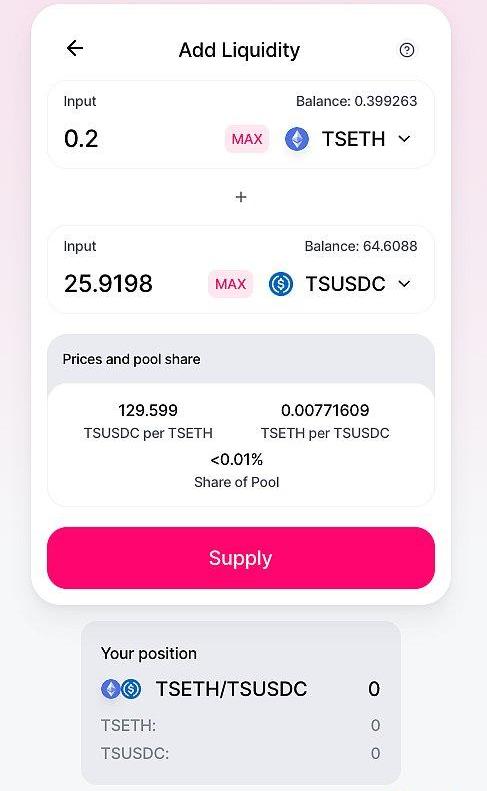 1.交易成功后,您可以在DEX中添加流動性。點擊**AddLiquidity。**我們以0.2枚ETH兌換25.9198枚USDT為例,點擊Supply。您的界面將自動跳轉到OpenBlock界面,點擊?確認?交易,輸入您到支付密碼。