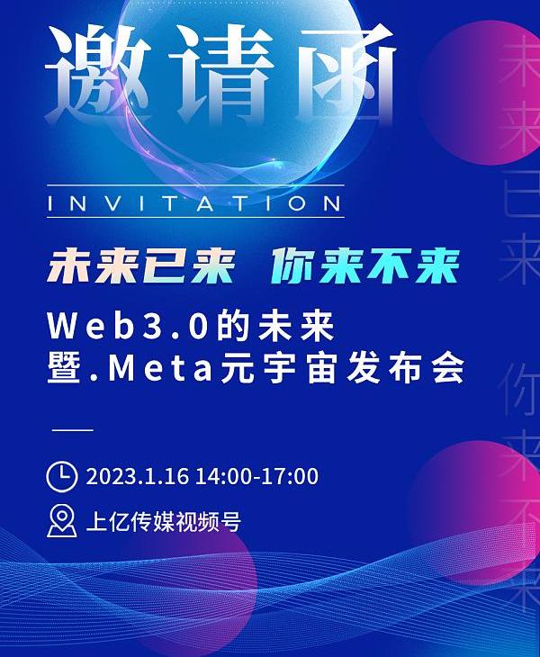 XRP/HKD-4.05%在數字經濟浪潮下,元宇宙產業正在加速融入到各行各業中。虛實共生和去中心化是元宇宙時代的特色,1月16日,《Web3.0的未來及.Meta元宇宙發布會》將在上億傳媒視頻號隆重開啟。從專家講座到.Meta域名現場注冊,上億傳媒攜手標域知產、UNSDAO將帶領更多人提前邁入元宇宙時代!
