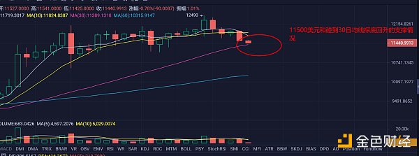 而當前應該關注兩點,一是如果周末保持在這樣的行情附近,下周的行情會怎么走,本周顯示沖高回落,下周除非有很強的逆勢拉盤力量,否則大概率會出現繼續調整。近兩天山寨幣在暴漲,說明比特幣和主流幣市場的資金都在山寨幣那邊打秋風,但同時也說明資金還在場內,早晚會回來,而回來后就是比特幣和主流幣種恢復漲勢的重大依仗。二是當前跌至了11500美元的關鍵支撐同時還有日線級別的30日均線,短期可能會有小反彈的需求,所以建議注重關注這兩天這個位置的支撐情況,若是這兩個支撐位反彈不強勢,下周可能會先走探底行情。