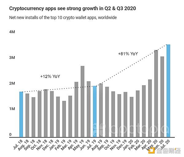 根據應用程序數據網站Apptopia最新研究數據顯示,2020年7月排名前十位的加密貨幣錢包應用程序的凈新增安裝量同比上漲了約81%。該公司分析師瑪德琳·萊納漢(Madeline Lenahan)在分析文章中寫道: