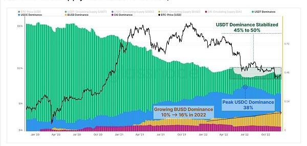BUSD脫穎而出,其市場份額從10%增加到2022年的16%,現在代表220億美元的總資產價值。