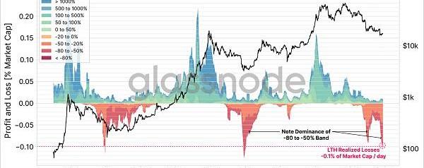 值得注意的是長期持有者,他們在這個周期實現了歷史上兩個最大的相對損失高峰。截至11月,長期持有者的日損失達到了市值的-0.10%的峰值,其規模僅與2015年和2018年的周期低點相當。6月份的拋售也同樣令人印象深刻,日損失達到市值的-0.09%,長期持有者鎖定了-50%至-80%的損失。