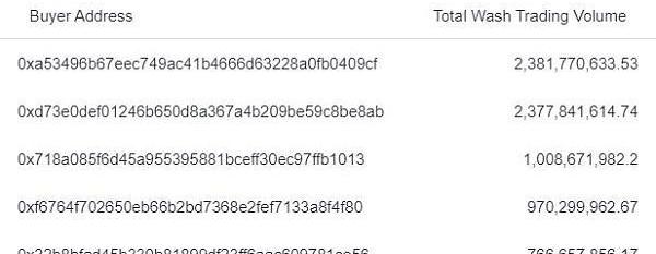 我們不確定為什么會這樣。但我們發現,這些用來洗盤的NFT項目的共同點是它們的版稅為零。這意味著洗盤交易的成本更低。我們只能假設一個大鯨或一群大鯨將其指定為他們首選的洗盤交易NFT。如果我們看一下Terraform的洗盤交易者名單,前2個錢包的交易額就接近$4.8B。?