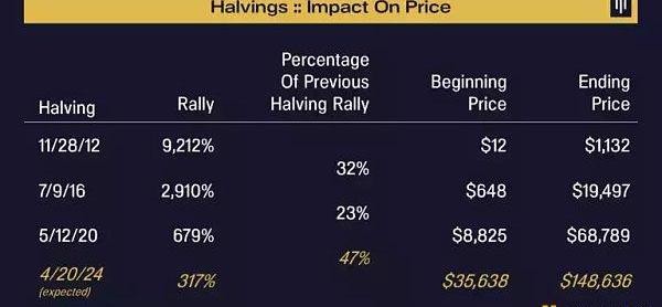下一次減半預計發生在2024年4月20日。由于大多數比特幣現在都在流通中,每減少一半,新供應量的降幅幾乎正好是其一半。如果歷史重演,那么在下一個減半之前比特幣將漲到3.6萬美元,之后漲到14.9萬美元。