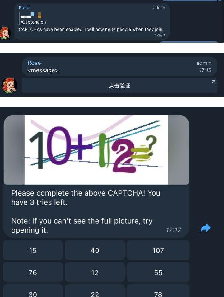 設置認證方式:/captchamodemath?,除了點擊外,為了增強安全性,可以設置進行驗證碼驗證(text)或數學計算驗證(math),Rose會DM新進群用戶,完成驗證后才可開啟聊天。