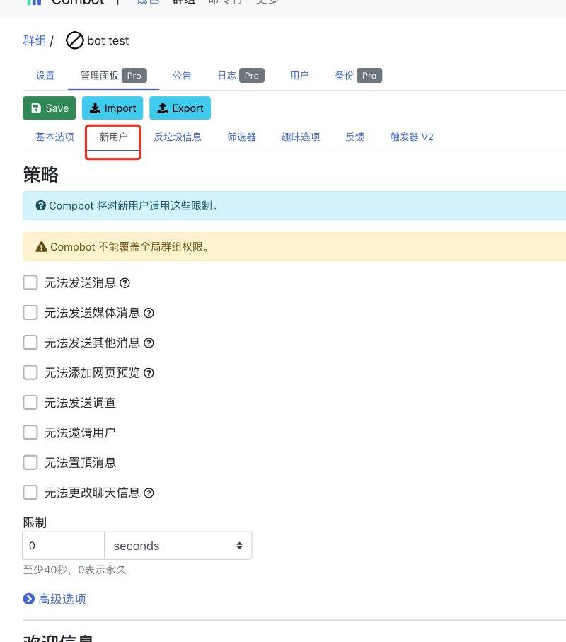 2、管理面板:在combot可以不用復雜的命令來設置運營規則,而是通過后臺的「管理面板」進行,這里有相對友好的用戶界面,幫助你設置用戶歡迎信息、入群驗證等。