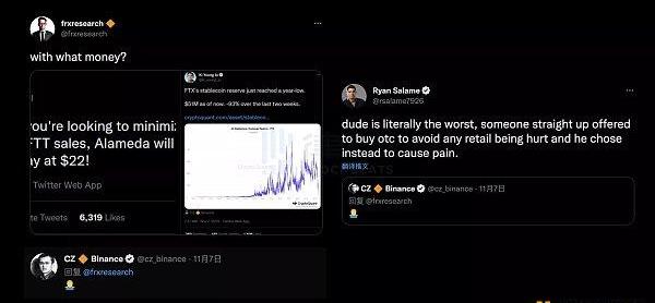 現在,FTX和Alameda不僅需要支付用戶提款,還要部署資本捍衛FTT的價值,Alameda的相關錢包地址也開始頻頻從各大交易所轉移資產進入FTX。與此同時,CZ卻在火上澆油,在一條質疑Alameda22美元回購承諾的推文下回復了一個聳肩表情。這也直接激怒了FTX數字市場CEO?RyanSalame,他在推特上直接引用CZ推文,表達了對其在公開市場拋售FTT的不滿。