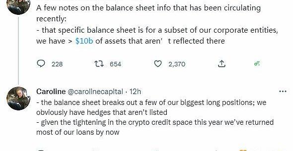 Alameda聯席CEOCarolineEllison回應Coindesk調查:關于最近流傳的資產負債表信息的一些注釋:特定的資產負債表是針對我們公司實體的一個子集,我們有超過100億美元的資產沒有反映在那里。資產負債表列出了我們最大的幾個多頭頭寸;我們顯然有未列出的對沖——鑒于今年加密信貸空間收緊,我們現在已經歸還了大部分貸款。