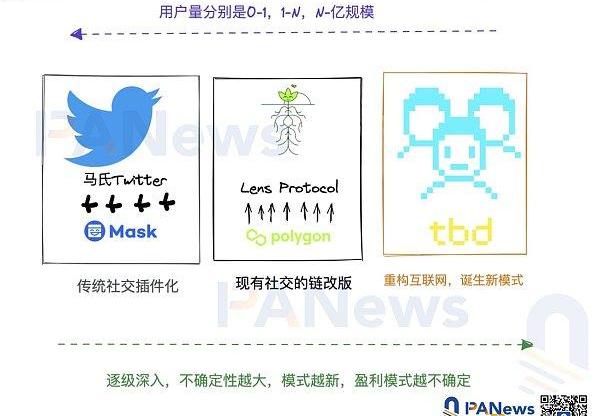 Twitter坐擁4億用戶,一舉一動都會對社交模式產生巨大影響,而LensProtocol是通過把現有的社交模式重新用區塊鏈的方式再實現一遍,而TBD推出的Web5,是用去中心化的方式思考下一代網絡。