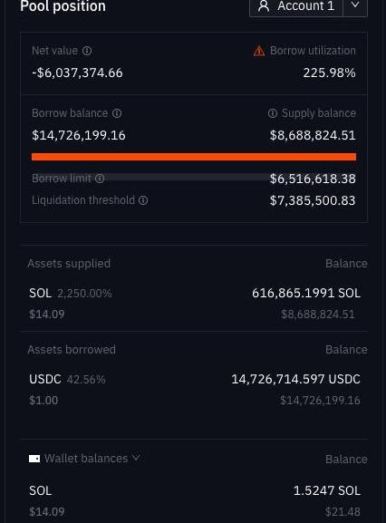 數據顯示,當前該地址在?Solend上存有約61.6萬枚SOL,但卻借出了1472.6萬美元的USDC,且該地址余額僅剩1.52SOL。